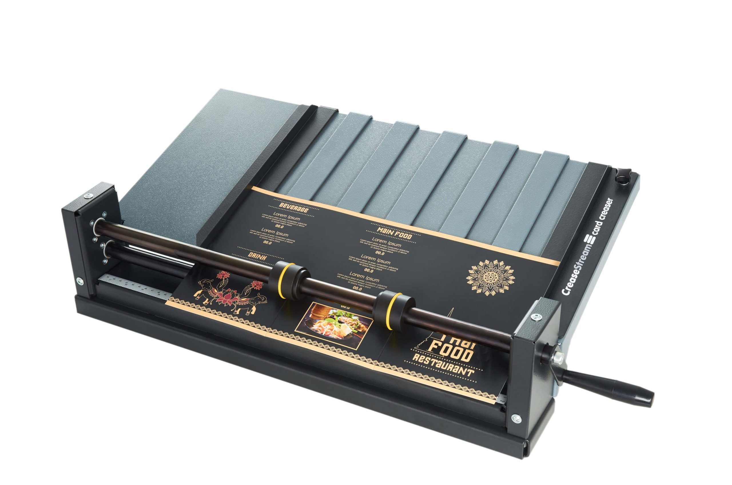 The CreaseStream Card Creaser Deluxe makes it possible to manually hand wind up to 2 creases simultaneously and easily outperforms the manual hand fed matrix creasing units that are currently on the market. The innovative creasing technology used in the CreaseStream Card Creaser will produce excellent quality creasing that eliminates fibre cracking 100% or your money back.